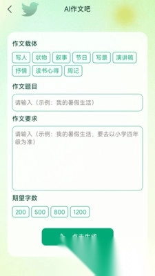 3. 配置了强大的智能系统帮助一键生成想要的作文,只需选择载体,输入题目,写作要求和期望字数。