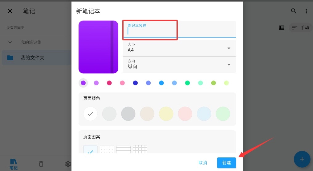 3、进入设置页面,输入笔记本名称,对页面方向、背景颜色等参数进行调整,最后点击创建按钮,完成相关设置。