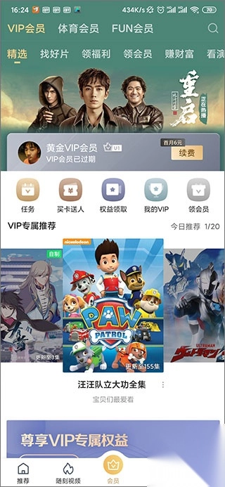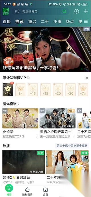 2、然后会看到推荐、随刻视频、会员、发现、我的五个板块,在推荐中有着大量的电视剧供用户观看,并且累计签到还能免费领会员哦!