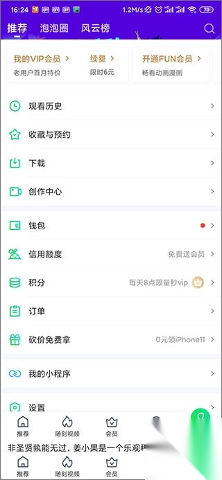 6、在我这里,具备观看历史、收藏预约、已下载的离线视频、创作中心、钱包等功能。