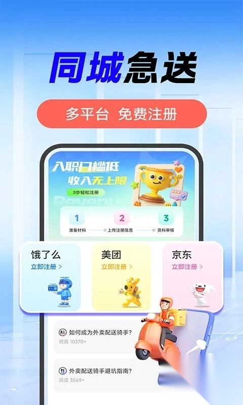 多平台一键注册,涵盖美团、饿了么、京东等主流外卖平台,注册流程大幅简化,为您节省宝贵时间。同时,我们提供详尽的骑手注册教程,助力您快速上岗。