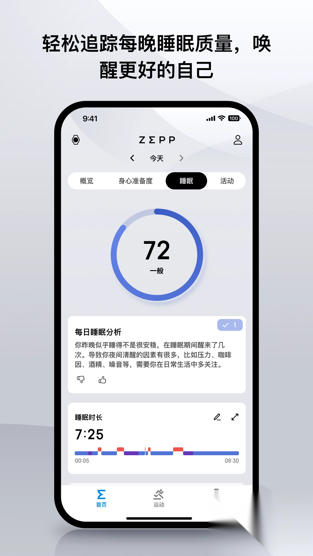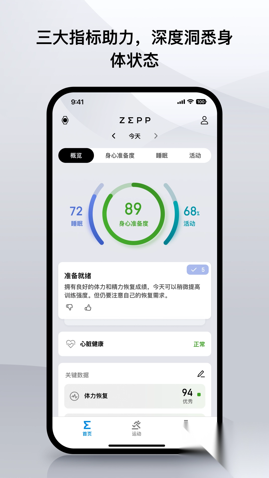 通过对日常生活全场景的连接 ,依托领先的数据分析能力和 AI 算法体系,Zepp 可以成为每个人的随身健康管家:帮助用户轻松了解身体变化,记录日常运动状态,更能通过对各项生理指征的全面、实时地 AI 分析,及时提供健康预警和专业指导,实现对健康的深度掌控。
