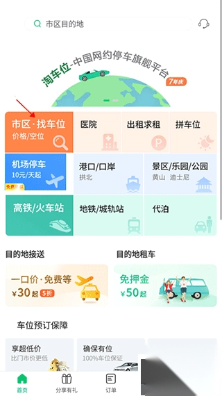 1. 进入首页,在“医院停车”与“市区停车”中做出选择,进而挑选附近医院或停车场的地址。