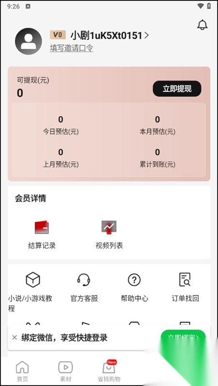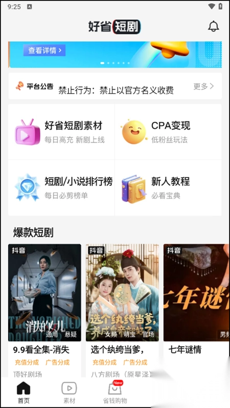 1、在软件首页,我们能够看到好省短剧素材、CPA变现、短剧/小说排行榜、新人教程等一系列板块。
