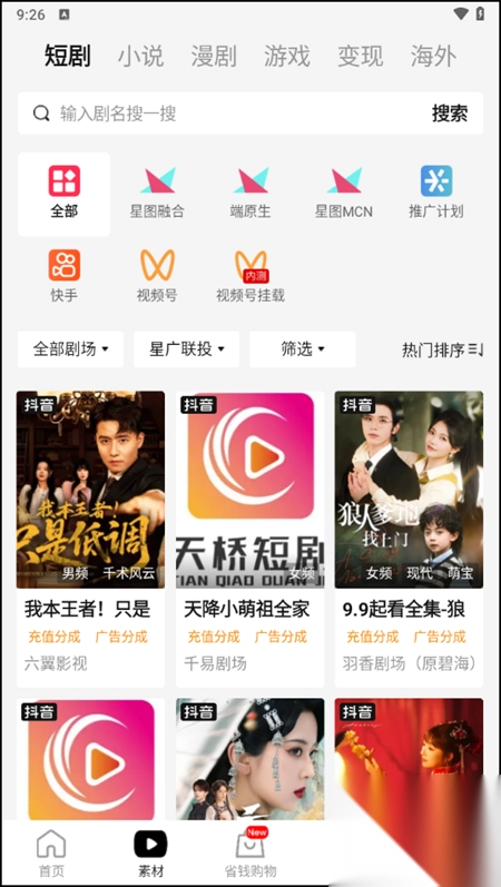 好省短剧app官方正版不仅能够为用户提供短视频创作灵感而且更是提供强大的变现途径,即借助先进的CPS(Cost Per Sale,即按销售付费)模式,这样一来不仅能够很好的解决了推广与收益问题而且更是能够很好的计算出收益可得,可谓是一举两得。