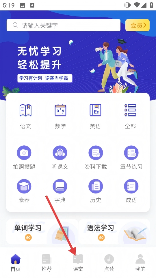 1、点击页面底部导航栏中的【课堂】图标,进入课程选择页面。