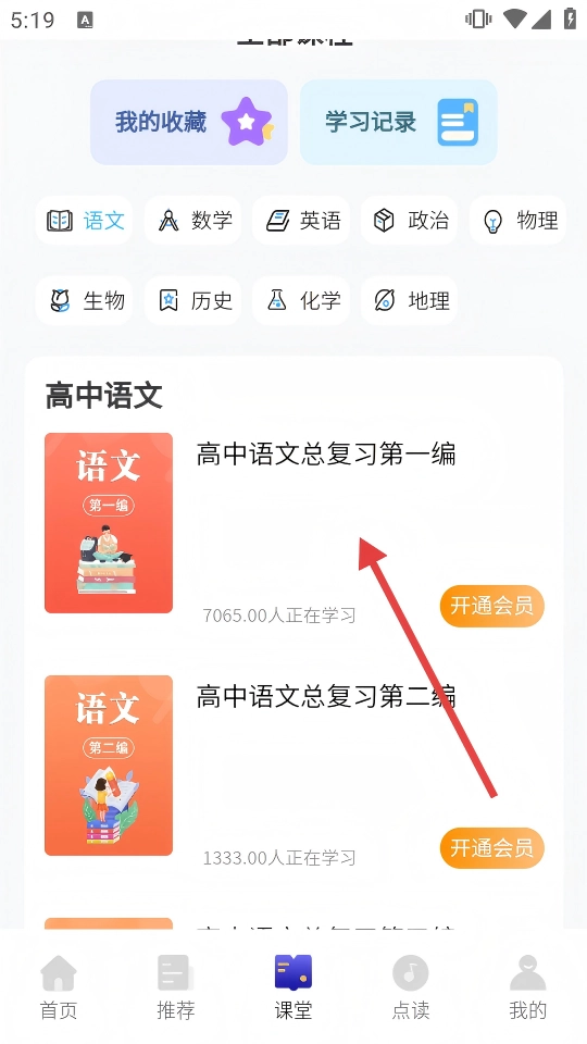 2、在课堂页面中,找到并点击【高中语文总复习第一编】课程条目。