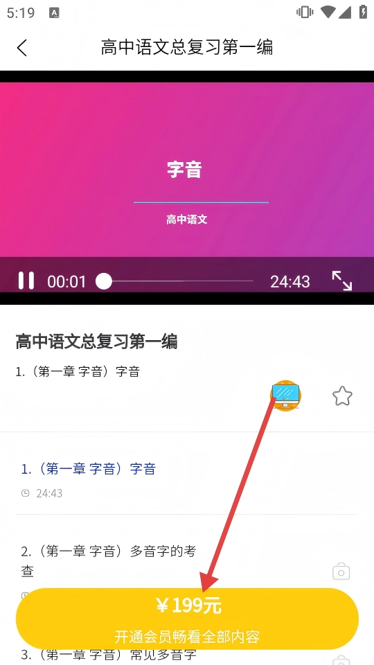 3、进入课程详情页后,点击页面下方的【¥199元开通会员畅看全部内容】按钮。