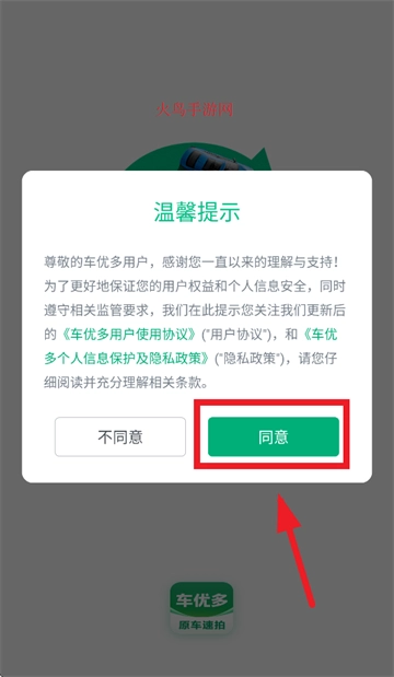 首先下载车优多app,完成安装后打开该应用。当出现温馨提示界面时,点击“同意”选项。