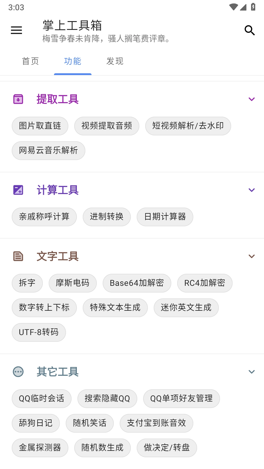 掌上工具箱App,一款功能超丰富的手机工具箱软件。这款App聚合了大量实用工具,系统工具、图片工具、查询工具、提取工具、计算工具、文字工具以及其它工具等应有尽有。海量日常工具无需复杂操作,在线就能使用。而且,多样化的工具实现了智能分类,用户查找使用起来轻松便捷,能有效解决各类实用问题。别犹豫啦,赶快下载体验吧!
