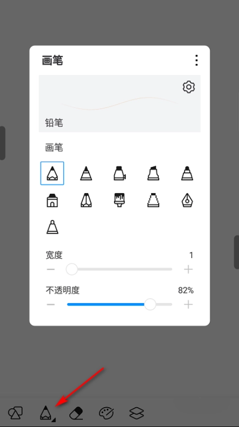 3. 下方的工具栏里,依次排列着形状、画笔、橡皮擦、调色板等绘画过程中极为常用的工具。点击画笔,就能选择画笔类型,并对画笔大小进行设置。