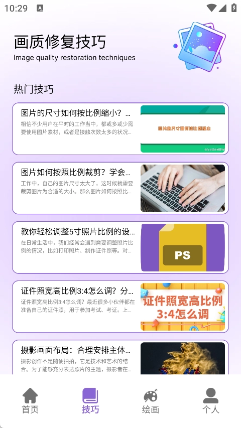 2、于技巧页面,使用户能够及时知晓各类画质修复技巧,熟悉不同修复操作。