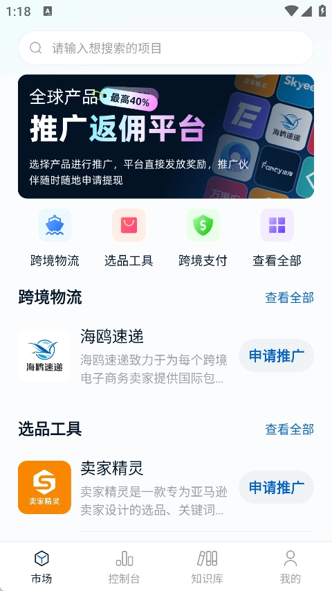 1、在市场页面上呈现跨境物流、选品工具、跨境支付等功能相关信息。