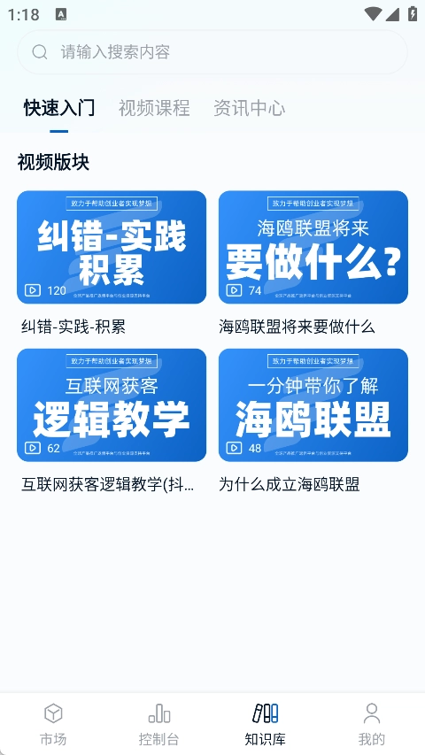 3、于知识库页面设置快速入门、视频课程以及资讯中心等功能。