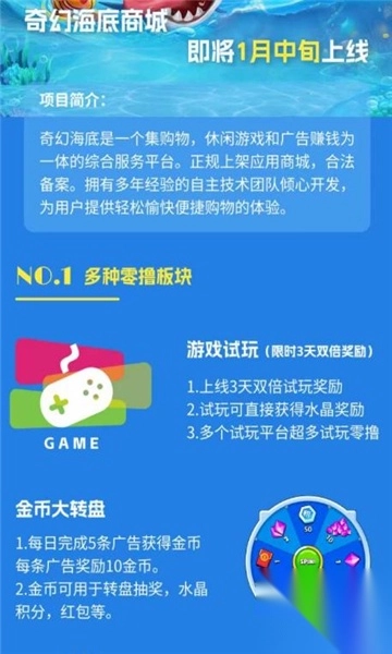 奇幻海底商城APP,是一个融合了游戏试玩、积分获取、互动任务以及丰厚奖励的综合性娱乐平台。用户在畅享轻松愉悦娱乐时光的同时,还能收获各式各样的福利。这款APP凭借丰富多元的游戏体验、灵活多变的任务系统,以及多种多样的奖励机制,为用户打造出一个将娱乐与奖励巧妙结合的平台。无论用户是单纯渴望尽情享受游戏的乐趣,还是期望通过简单操作就能获取积分与礼品,都能在奇幻海底商城APP中找到契合自身需求的途径。