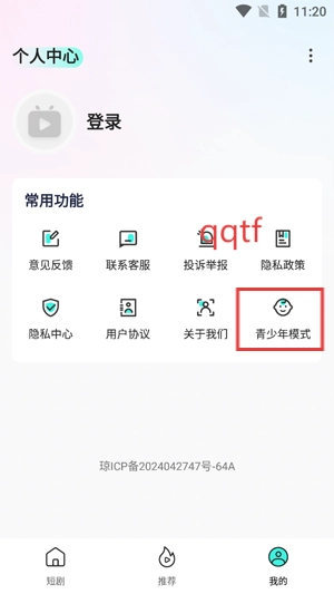 打开你的哔哔免费短剧App,在个人中心点击青少年模式。