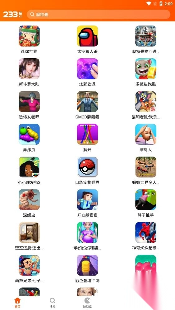 2、点击上方的框架,在其中输入你想要搜索的游戏名称,接着点击搜索按钮,此时页面便会展示出你想要的游戏,或者与之相关的游戏,比如奥特曼相关游戏。