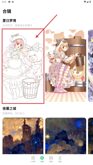 2. 在合辑页面,从夏日梦境合辑中挑选线稿作品,进而进入涂色界面。