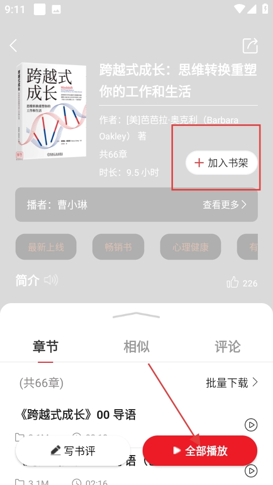3、于详情页,可点击“加入书架”或“全部播放”,实现收藏或收听操作。