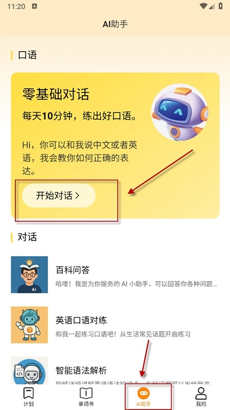 点击下方的4、“AI助手”,可以开始对话,趣味学习英语。