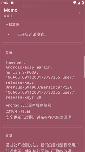 2、开启momo环境检测软件后,系统提示环境存在问题,检测到面具的隐藏root模块。