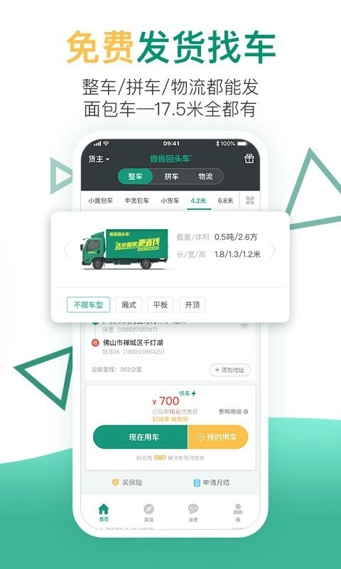 货主可借助省省回头车预约回头车、回程车、返程车以及顺风车来提货与送货。平台提供各种大、小货车,车型多样,无论是同城运输还是跨城运输都能满足。而且,运费相较市场价格优惠30%,货主能够自主挑选合适的司机完成提货与送货流程。