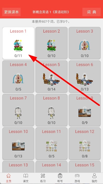 2、于课程选择界面,点击Lesson1,随即进入此课程的单词学习页面。