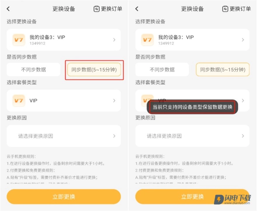 当前仅允许同类型设备相互进行数据同步与更换操作。