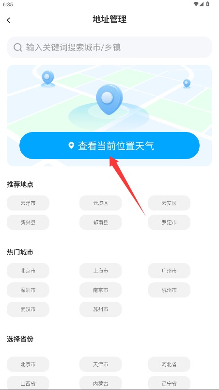 1首次使用时,需开启定位权限,系统会自动展示当前位置的天气信息框。若要添加其他城市,点击搜索栏,输入地名便可完成。