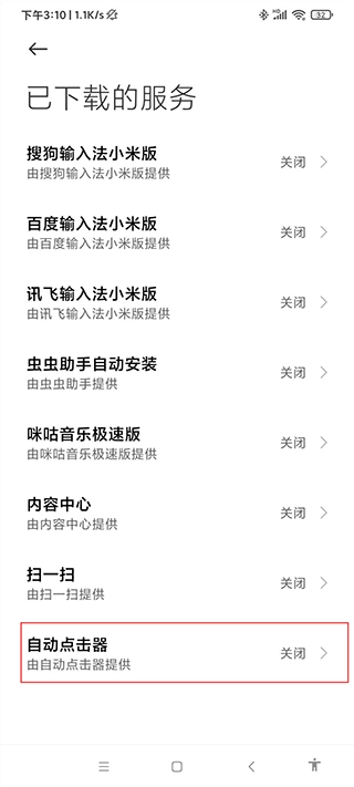 5、寻找到“自动点击器”,其状态同样为默认关闭,需手动开启。