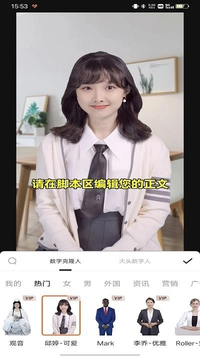 3、接下来在模板里挑选自己所需的数字人形象,或者从自己的相册进行导入。选择完毕后,点击右侧的√号。