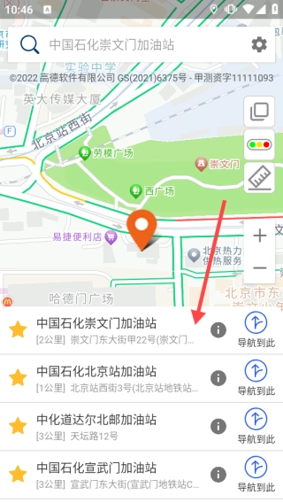 2. 在搜索结果里寻找到目标地点,例如【中国石化崇文门加油站】,点击后进入详情页面。