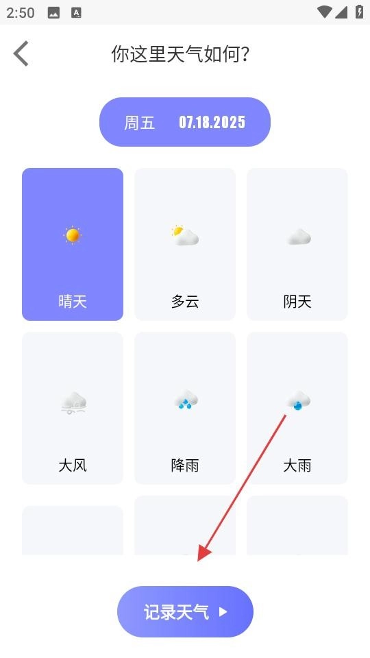 1、打开小小记录软件,进入日记页面,点击新建日记,跳转天气记录页,选择当日天气,点击记录天气。