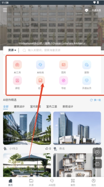 提供AI绘图创作新方式,支持直接拍照生成效果图方案。同时,配备多种设计增效AI工具,还提供海量免费资源素材、灵感图片、设计案例以及经验教学内容。