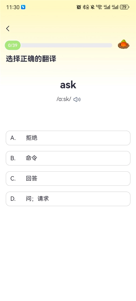 3、进入章节后,你能够挑选不同的词语展开学习,同时还能进行单词播放与翻译操作。