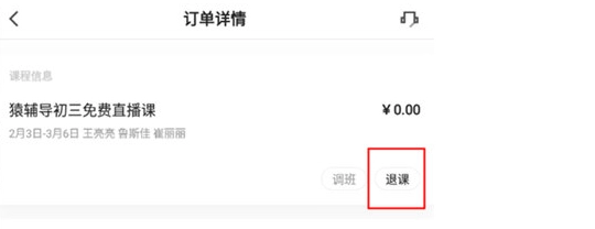 2、在订单里找到对应课程的订单明细并进入,点击其中的【退课】按钮就可以了。
