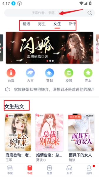2、在书城,你能够依据分类或者关键词搜索,来寻觅自己心仪的小说。