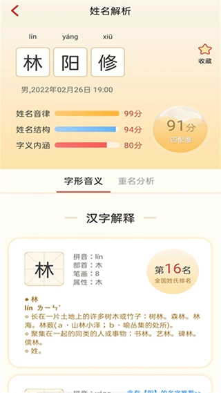 2、专业大师姓名解析:一键即可查询姓名的拼音、笔画、五行、吉凶,还能对字形意义进行分析,助您轻松解读好名字!
