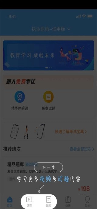 3、打开软件后,新人免费区内设有精选题库与名师课程可供学习。