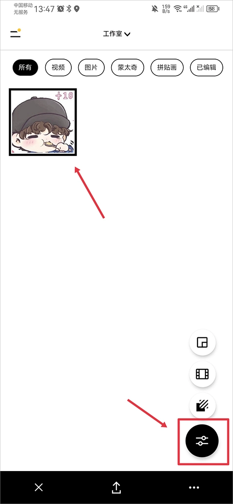 3、照片导入后,先轻点一下照片,随后点击编辑器按钮。