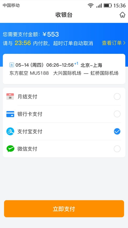 3、依据所填写的出差行程,查看所需支付的金额,并向用户提供多种支付方式以供选择。