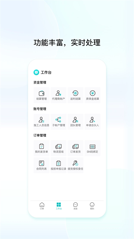 2. 在订单主页面可进行拓客接单操作,订单进度清晰呈现,安装进度实时推进。