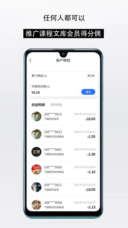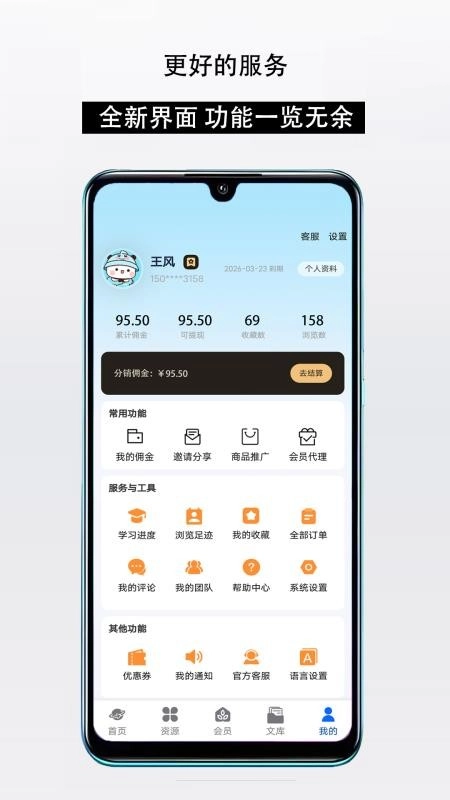 5、于个人中心,能够查看全部佣金收益与学习进度,同时也能浏览所有收藏及历史足迹等相关信息。