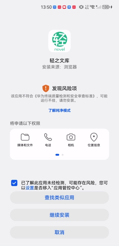 3、找到并点击勾选“已了解此应用未经检测……”这一选项,随后点击“继续安装”按钮。