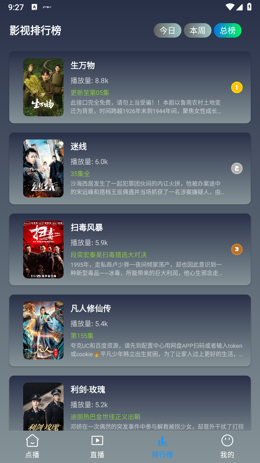 4、轻点底部的排行榜按钮,便能查看日榜、周榜以及总榜。