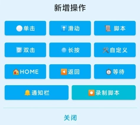 单击、双击、长按以及自定义都属于点击操作,只是参数存在差异(持续时长和次数不一样);滑动操作有两个标记,一个是起始点,另一个是终点,序号相同,箭头指示方向;脚本操作能够选择在当前脚本中执行另一个脚本;HOME和返回操作分别对应手机上的HOME键(回到手机桌面)和返回键;等待操作可以随机等待一段时间,之后再执行后续操作;通知栏操作可以打开系统通知栏;录制脚本操作能够对手动操作进行录制,并自动将操作追加到当前脚本。