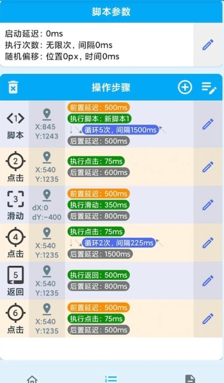注意:此界面的保存按钮仅能将该操作的参数保存至内存,无法保存脚本。若要保存脚本,需点击悬浮窗上的保存按钮(也可点击参数设置页、脚本列表页的保存按钮)。5. 参数设置界面。除了在悬浮窗操作,我们还能在参数设置界面对脚本进行全览或批量编辑。在首页点击参数设置或参数标签,即可进入参数设置界面。