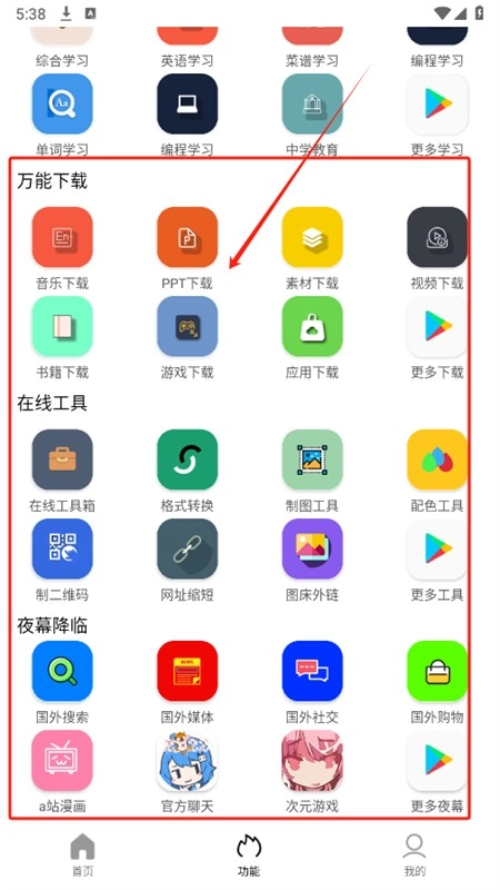 5、功能页面为大家提供了在线工具、万能工具、文字阅读等更多功能。