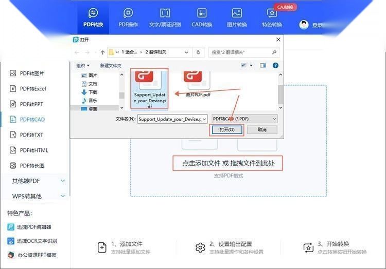 2. 完成文件上传有两种方式:一是直接把需要转换的PDF文件拖到指定区域;二是点击【添加文件】按钮,在弹出的对话框里选择文件进行上传。