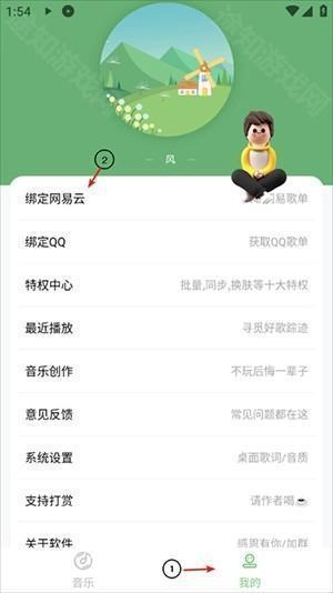 1、如下所示,此处展示的是网易云歌单的导入方法。首先进入“我的”页面,接着点击绑定“网易云音乐”。
